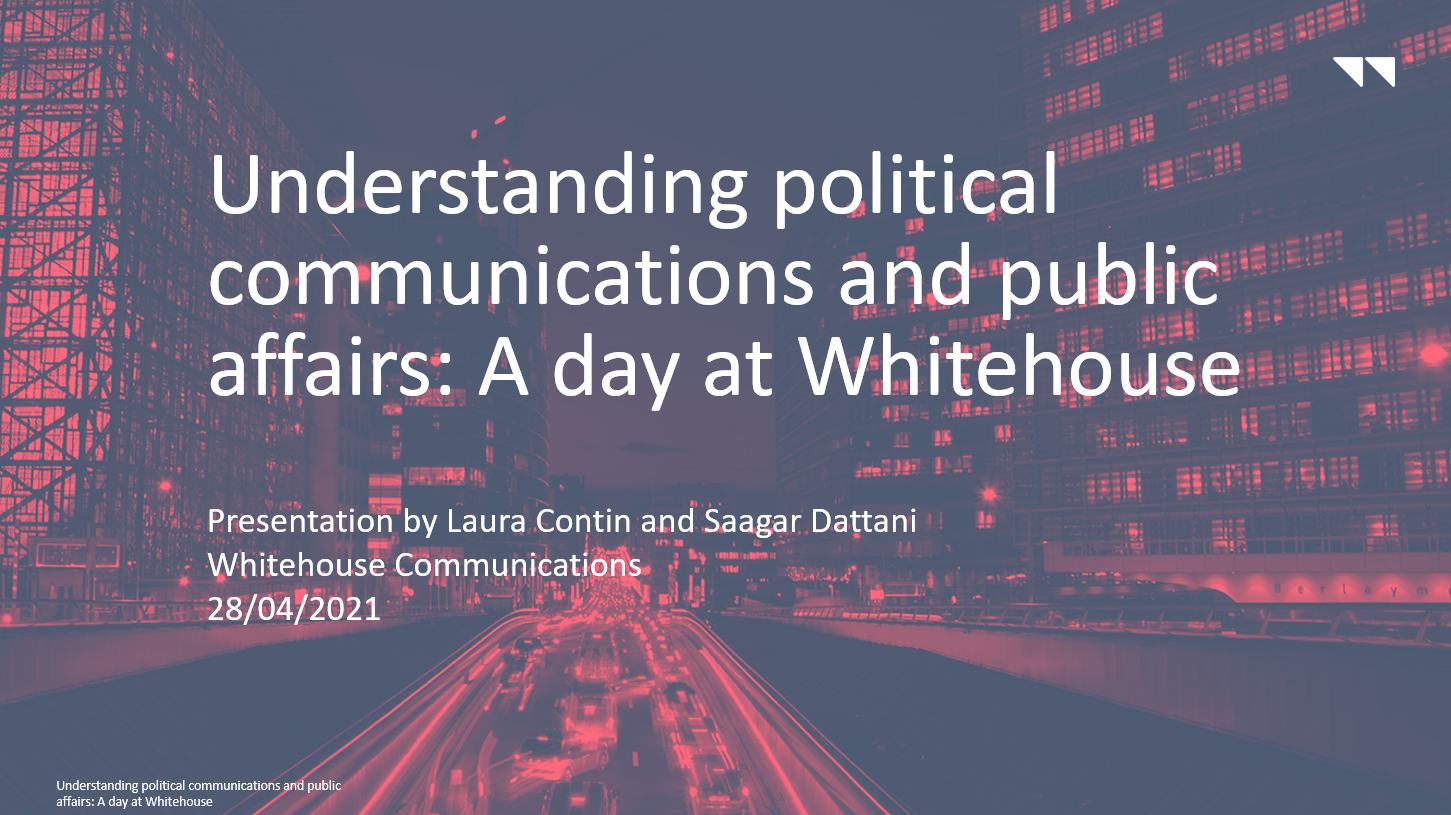 Two members of the Whitehouse’s team, Laura Contin and Saagar Dattani, yesterday (28th April) provided an introduction to political consulting in the United Kingdom and the European Union and what a day at Whitehouse Communications involves. They shared some advice on what to look out for when applying for roles, key points to consider, and what consultancies look for in prospective applicants.
