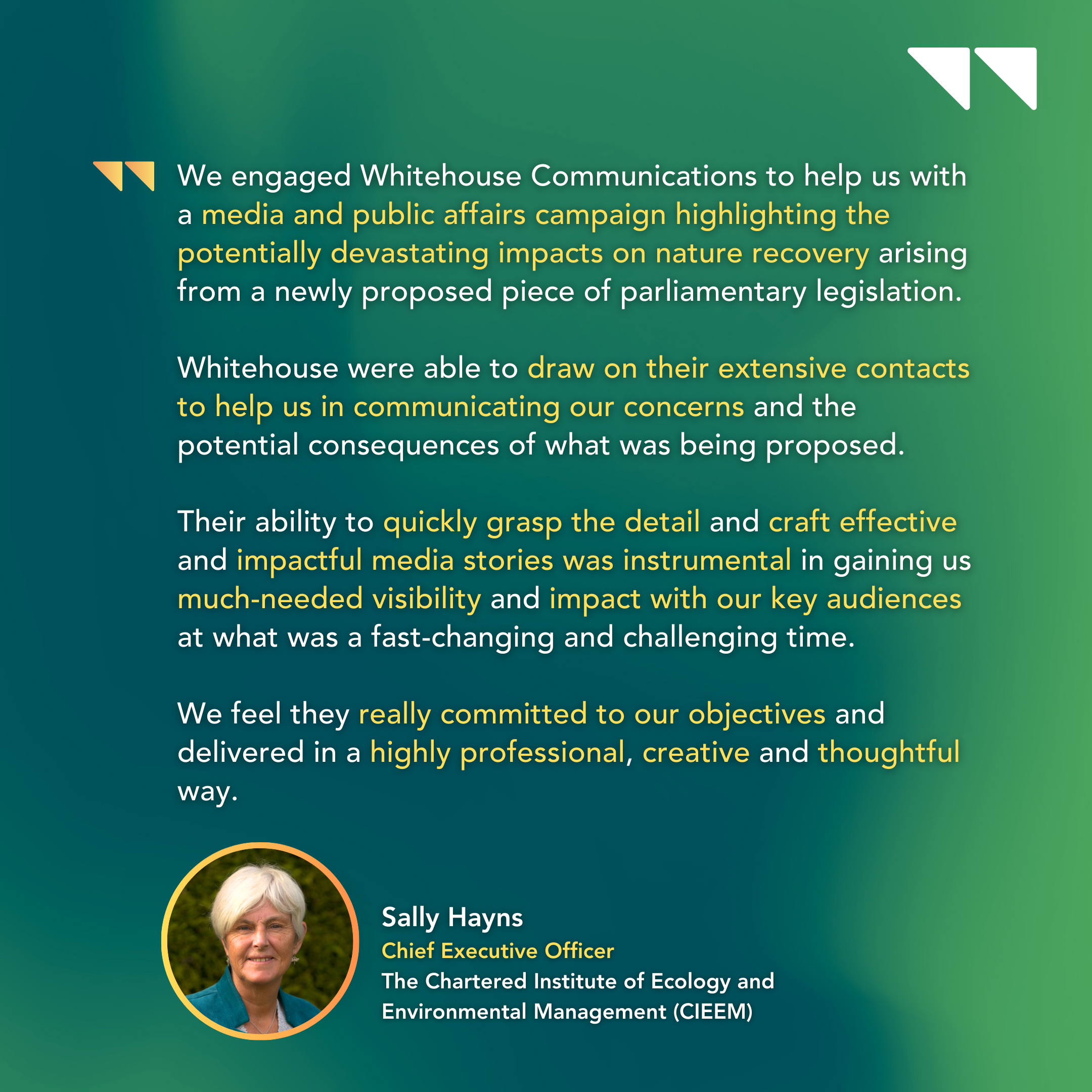 The Chartered Institute of Ecology and Environmental Management (CIEEM) appointed Whitehouse Communications to design and deliver a high-impact media and public relations campaign to influence the Government’s highly contentious Planning and Infrastructure Bill at a critical juncture in its parliamentary journey.